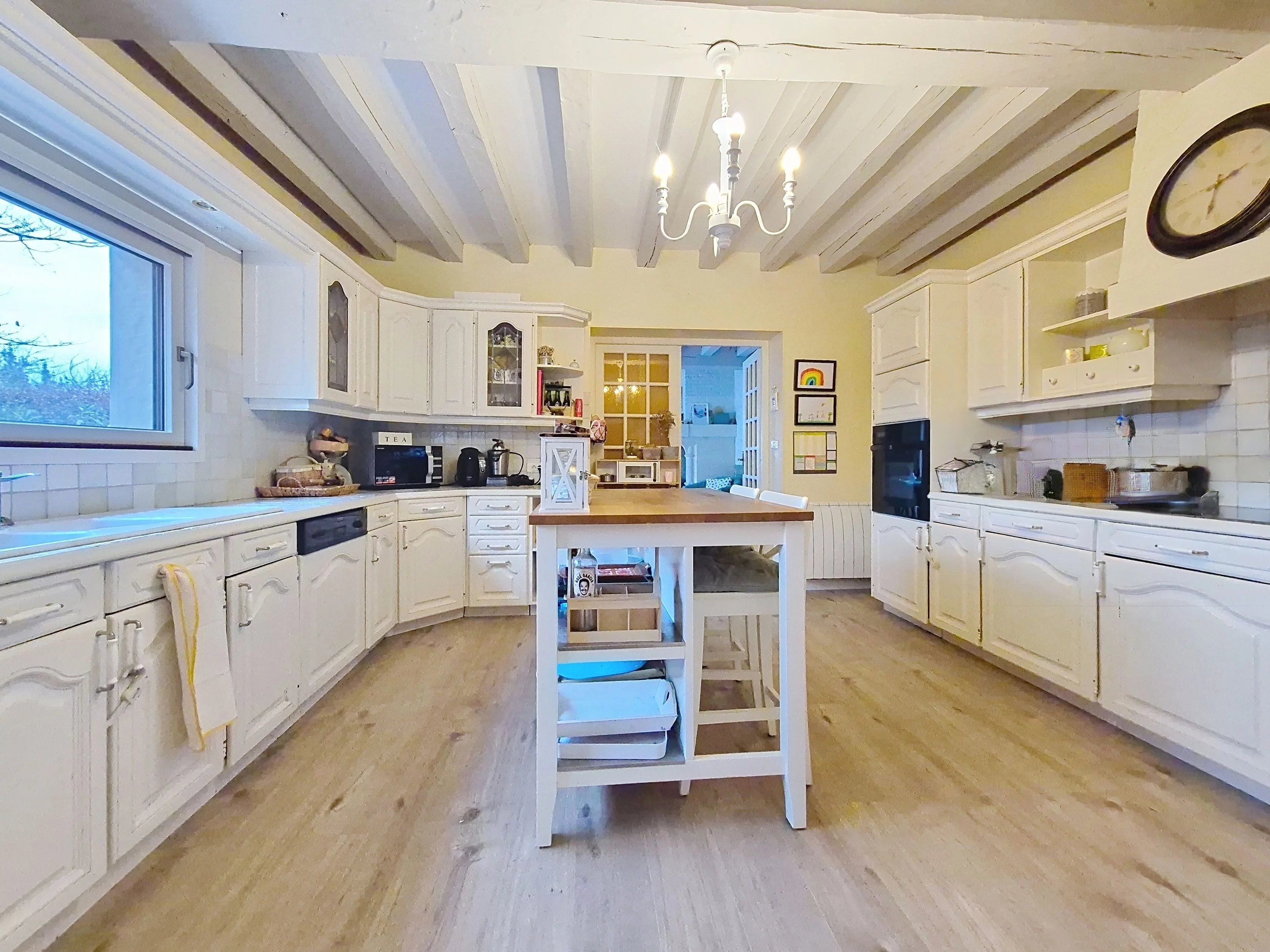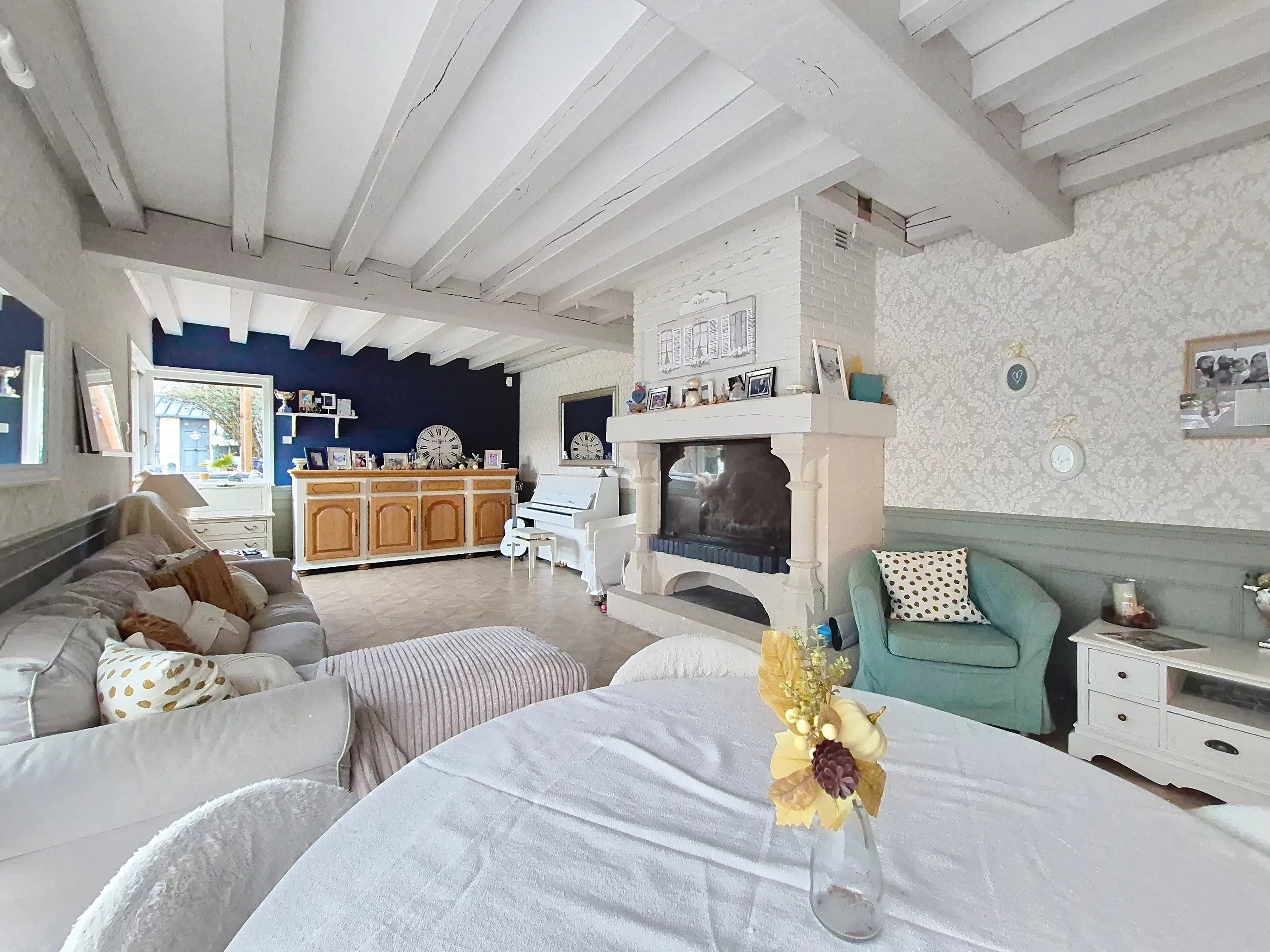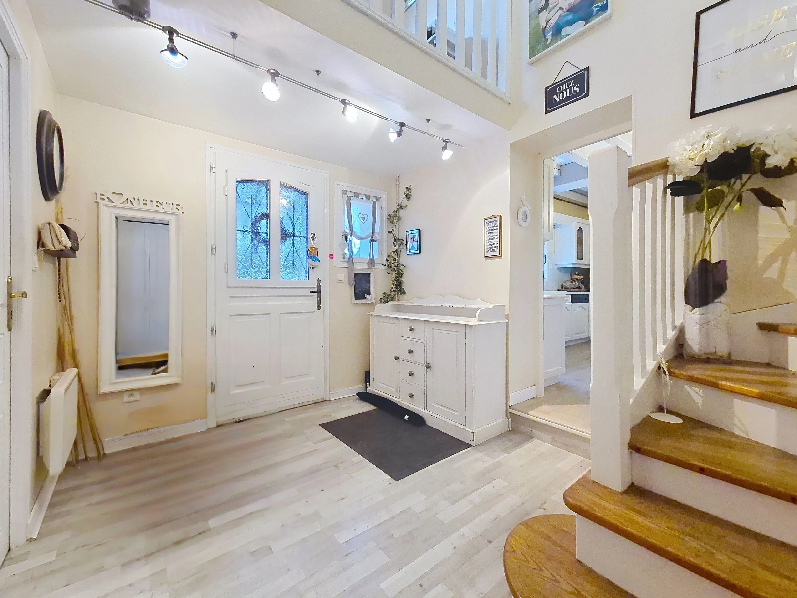 Dès l’entrée, le volume est mis en valeur par un escalier central et un palier en mezzanine, apportant une belle sensation d’espace. La cuisine, aménagée et équipée, s’ouvre sur un séjour lumineux agrémenté d’une cheminée, créant une atmosphère chaleureuse et conviviale, idéale pour recevoir famille et amis.